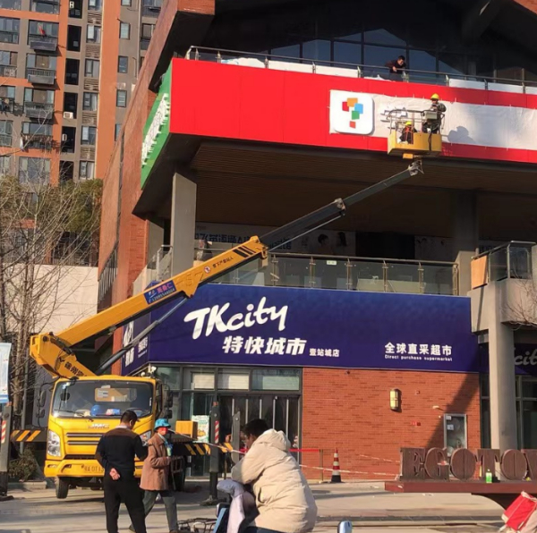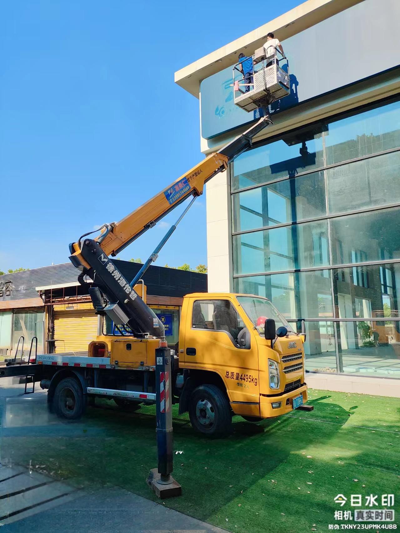 18米云梯車安裝酒店招牌施工現(xiàn)場