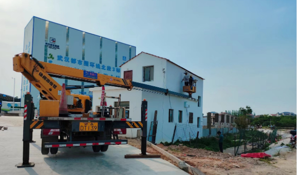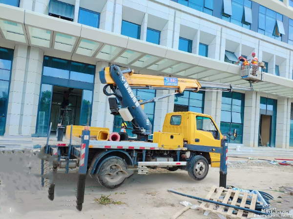 18米云梯車修補(bǔ)外墻瓷磚施工現(xiàn)場